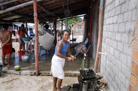 “O rio que controlava o mar. Com a construção da barragem de Xingó, o rio secou e o mar derrubou o nosso povoado”, conta Silvânia Souza Barreto, de 31 anos. Nascida em Cabeço, no município de Brejo Grande-SE, ela chegou a morar na capital Aracaju-SE, mas voltou para Cabeço. O povoado fica à margem do São Francisco e está sendo “engolido” pelo mar. A grande maioria dos moradores tradicionais de Cabeço já se mudou para Saramen, povoado próximo da região da foz do Rio São Francisco. “A água que temos vem da bomba, tem umas três no Cabeço, o pessoal não tem condições de ter uma”, emenda Luciano Lessa da Cruz, o Dedico, 27 anos, nascido no balneário de Guarujá-SP e casado com Silvânia. Segundo ele, o custo total de instalação de uma bomba não passa de R$ 150. A água é usada para tudo: cozinhar, beber, lavar roupa, tomar banho, etc. “Quase todo mundo vem pegar água aqui na nossa bomba”.