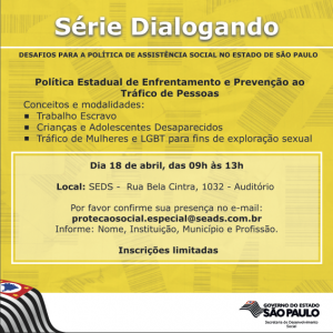Três debates estão previstos para abril e maio. O primeiro deles acontece em São Paulo, onde a Coordenadoria de Assistência Social do Estado de São Paulo realiza nesta quinta-feira, 18 de abril, o evento “Série dialogando: desafios para a Política de Assistência Social no Estado de São Paulo”, que deve abordar o trabalho escravo, a problemática de crianças e adolescentes desaparecidos e o tráfico de pessoas para fins de exploração sexual. O objetivo é trocar experiências com profissionais da área com a Equipe de Proteção Social Especial da coordenadoria.