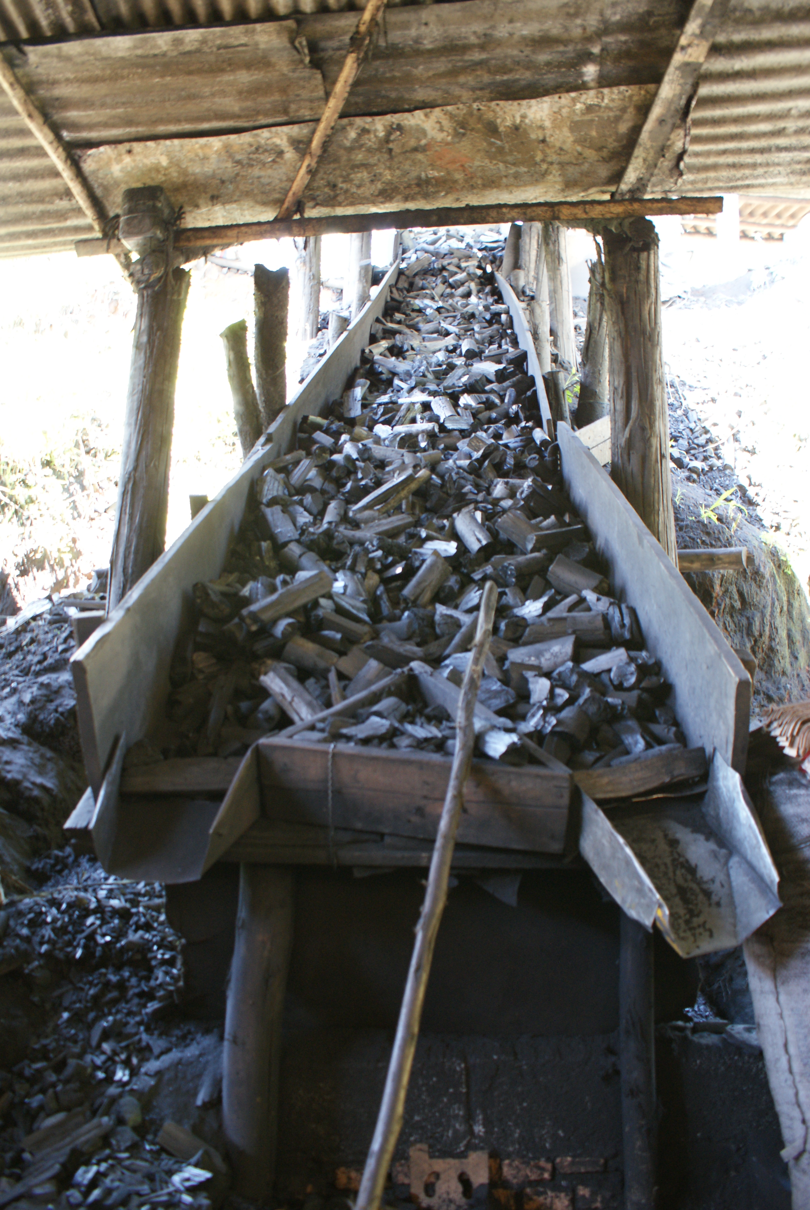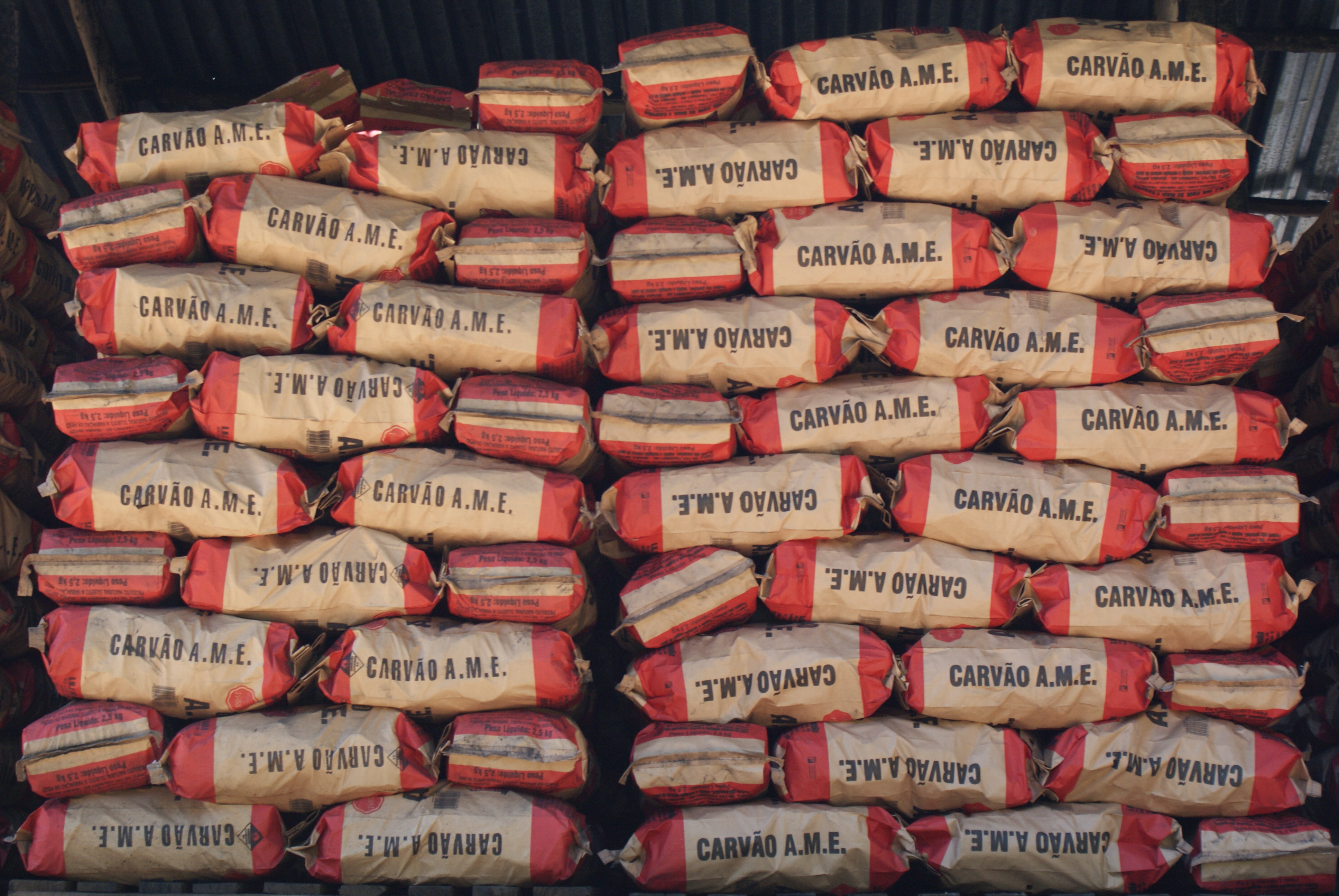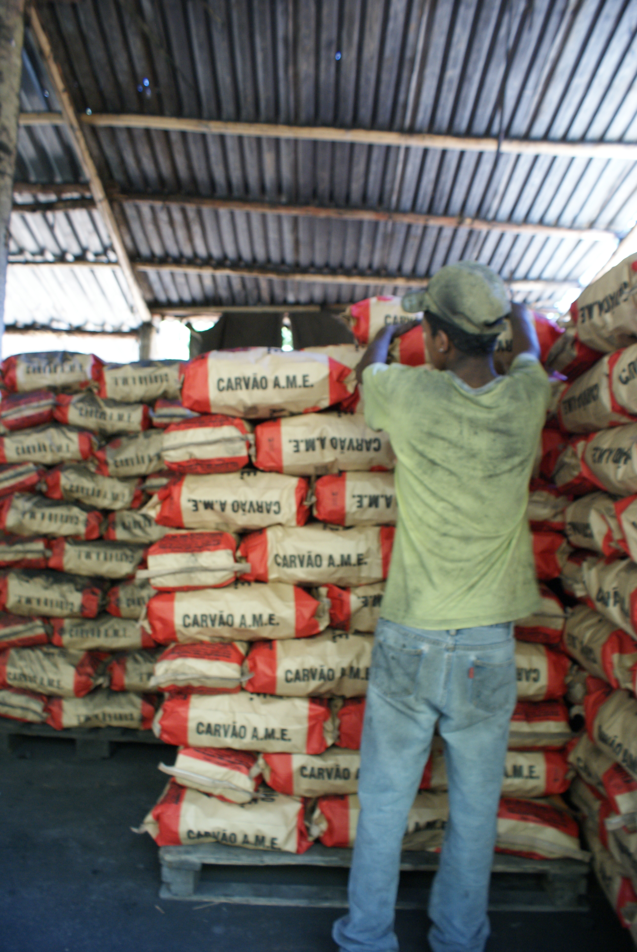Nos fundos da casa que fica na entrada da carvoaria, à direita e num nível abaixo do terreno onde estão os fornos de carvão e a madeira pronta para ser carbonizada, um grande galpão é reservado para o serviço de empacotamento do produto resultante do trabalho dos carvoeiros. Lá, uma mulher de 37 anos, o marido, o filho de dezesseis anos e o sobrinho de onze colocam o carvão – que chega ao local por meio de uma espécie de escorregador de madeira, a partir da área dos fornos – dentro de embalagens do Carvão A.M.E. e as fecham com grandes grampeadores. Todos eles, assim como o senhor septuagenário, estão inteiramente cobertos de pó preto.