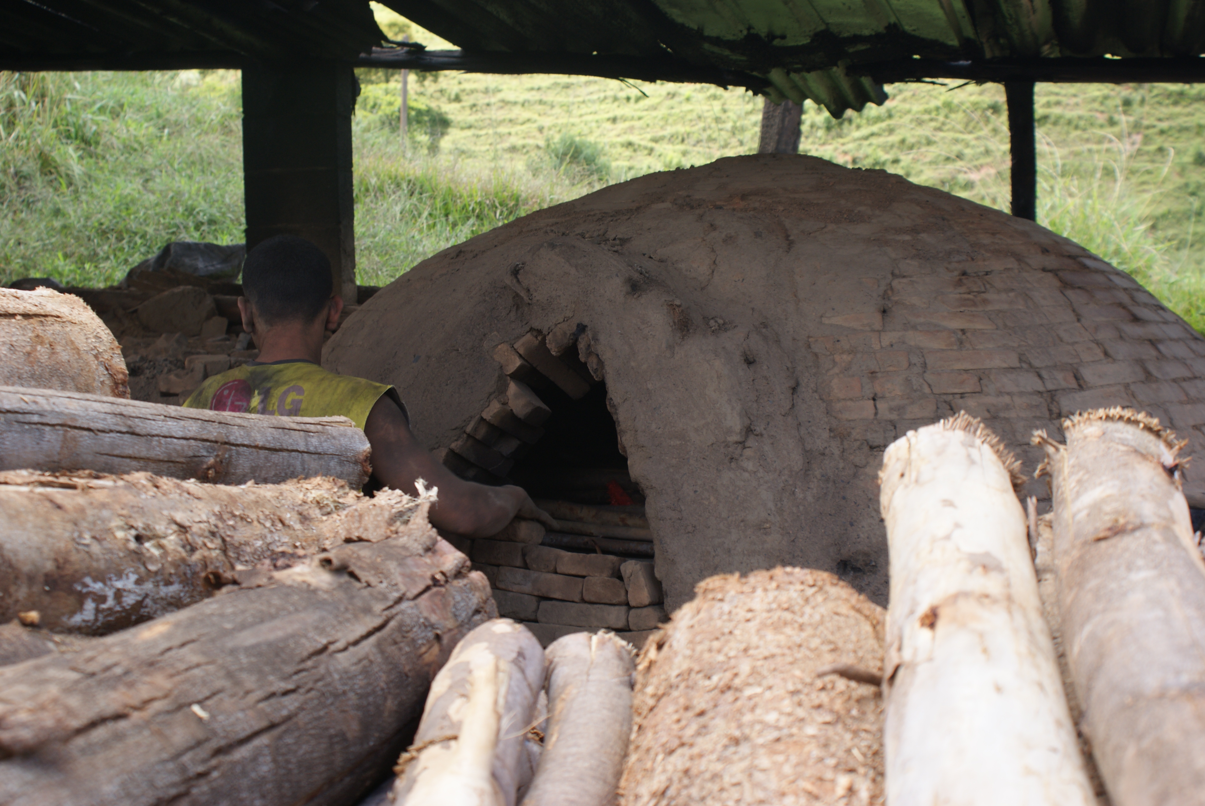 Ainda mais adiante, está um senhor baixo de pele negra, de nascimento e de carvão. Trabalha no estabelecimento, que produz o Carvão A.M.E., há doze anos, sem registro em carteira nem salário. A jornada, em média, é das sete da manhã até as quatro ou cinco da tarde. Ganha por produção. Recebe R$ 1,40 por cada saco de carvão, a cada quinze dias. Ele diz que em dias bons, quando não sente dores, chega a produzir de trinta a quarenta sacos. Apesar da idade avançada, passa o dia carregando toras de madeira pesadas e as jogando dentro dos fornos superaquecidos. As dores são por conta de uma hérnia inguinal que tem há dois anos – está esperando que a realização de uma cirurgia. Quando estão mais fortes, a produção cai muito, e o dinheiro no fim da quinzena também. Hoje, calcula, recebe em torno de R$ 700 por mês, que complementam o salário mínimo que ganha como aposentado.