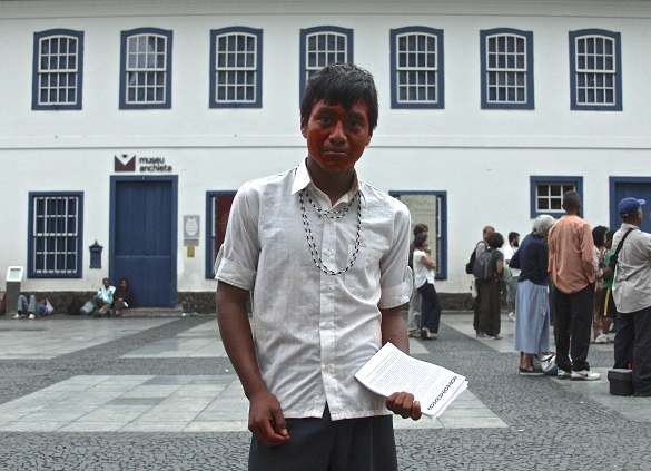 O cacique Karaí Mirim Vitor Fernandes, da aldeia Tekoa Pyau, da Terra Indígena Jaraguá, na Zona Norte de São Paulo, responde. Em guarani, sua língua. Os brancos não entendem. Então, diz, em português: “Respondi na minha língua porque aqui é um local sagrado”.