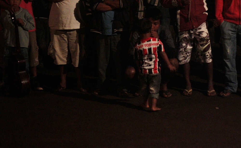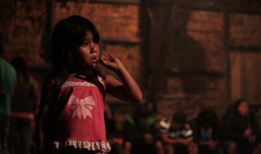 Chão de terra batida, pouca luz. De um lado, bancos de madeira, dois violões encostados na parede e uma pequena armação feita do mesmo material fincada no chão, servindo como uma espécie de altar. Do outro, mais bancos e uma fogueira cercada por cachorros que se esquentam na manhã fria e chuvosa. Uma senhora de seus setenta anos fuma um cachimbo indígena. Ao lado, crianças brincam. Estamos na casa de reza da aldeia.