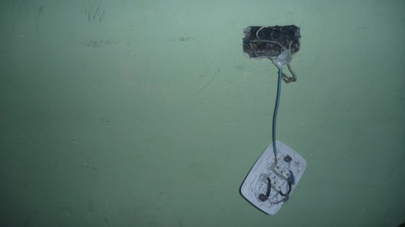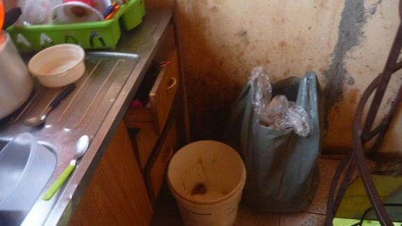 Fezes de gato em banheiro do alojamento em frente à oficina. Cheiro de esgoto era onipresente em toda a casa