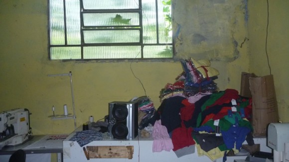 Em meio a pilhas de camisetas, bermudas e moletons, entre linhas, papéis, sacolas e garrafas plásticas espalhadas pelo chão, seis pessoas trabalhavam no momento em que os auditores e procuradores chegaram à oficina, por volta de 10h30. Com apenas duas janelas e quase nenhuma ventilação, o ambiente era quente e abafado. O teto de tijolo baiano tinha goteiras e fissuras – em algumas partes o tijolo estava quebrado e podia se desprender.