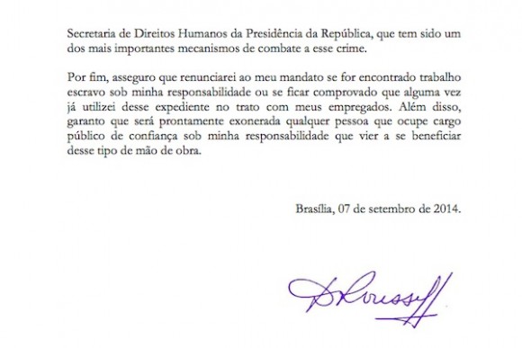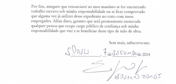 Por fim, asseguro que renunciarei ao meu mandato se for encontrado trabalho escravo sob minha responsabilidade ou se ficar comprovado que alguma vez já utilizei desse expediente no trato com meus empregados. Além disto, garanto que será prontamente exonerada qualquer pessoa que ocupe cargo público de confiança sob minha responsabilidade que vier a se beneficiar desse tipo de mão de obra.
