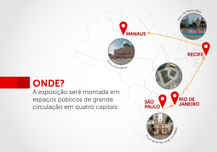 A mostra será montada em espaços públicos de grande circulação – como praças e parques – com fácil acesso por meio de transporte público de ao menos quatro capitais do país: Manaus, Recife, Rio de Janeiro e São Paulo. A exposição ocupará uma área de aproximadamente 320 metros quadrados, com containers especialmente customizados para receber as instalações artísticas. Ao final, a exposição será doada ao poder público para que possa ser transformada em espaço de visitação permanente.