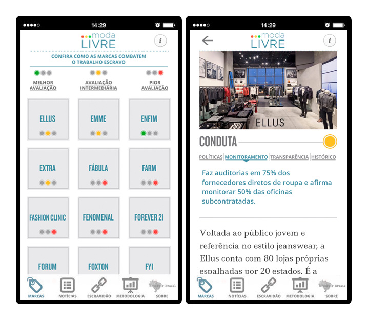 Além de analisar o histórico e as ações de combate ao trabalho escravo que são tomadas pelas marcas mais relevantes no mercado de moda brasileiro, o Moda Livre também traz uma seção de notícias com matérias do site da Repórter Brasil sobre trabalho escravo na indústria de roupas. É importante ressaltar que o aplicativo não recomenda que o consumidor compre ou deixe de comprar de determinada marca ou loja.
