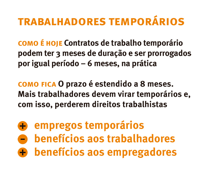 O governo Michel Temer propõe que trabalhadores possam ser contratados por até oito meses sem diversos direitos trabalhistas. A sua proposta de reforma trabalhista aumenta o prazo máximo para contratos temporários de 90 dias para 120 dias, prorrogáveis por igual período. A medida deve aumentar o número de funcionários temporários, que não têm direito ao seguro-desemprego, à estabilidade para gestantes ou a verbas rescisórias como o aviso prévio e os 40% de multa do FGTS.