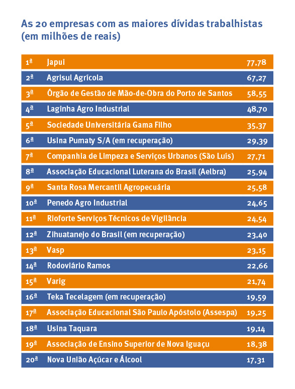 O órgão responsável pela gestão da mão de obra do trabalho portuário do Porto Organizado de Santos e gigantes do setor educacional, como a administradora da universidade Ulbra, no Rio Grande do Sul, integram a lista de empresas ativas que devem aos cofres públicos. No topo da lista das inativas, está a Japui, empresa varejista da capital paulista. A principal atividade da empresa, fundada em 1990, era o arrendamento e loteamento de imóveis. Da dívida de R$ 77 milhões, R$ 13 milhões são salários vencidos. Procuradas, as duas empresas não responderam aos emails da Repórter Brasil.