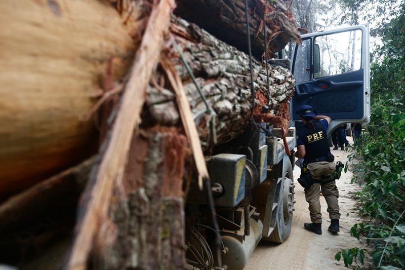 Brazilian Federal Highway Police investigates truck that was carrying illegal logs to sawmills in the city of Uruará (Photo: Lunaé Parracho/Repórter Brasil)