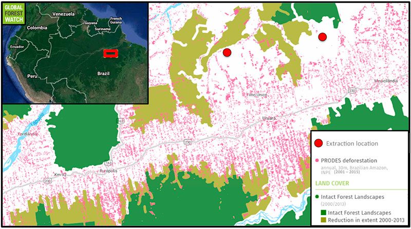 Satellite data from the Brazilian government show this area of Pará lost nearly 400,000 hectares of tree cover between 2001 and 2015. Small logging camps like that from which João and his colleagues add to this toll – but often log too selectively to show up via satellite monitoring.