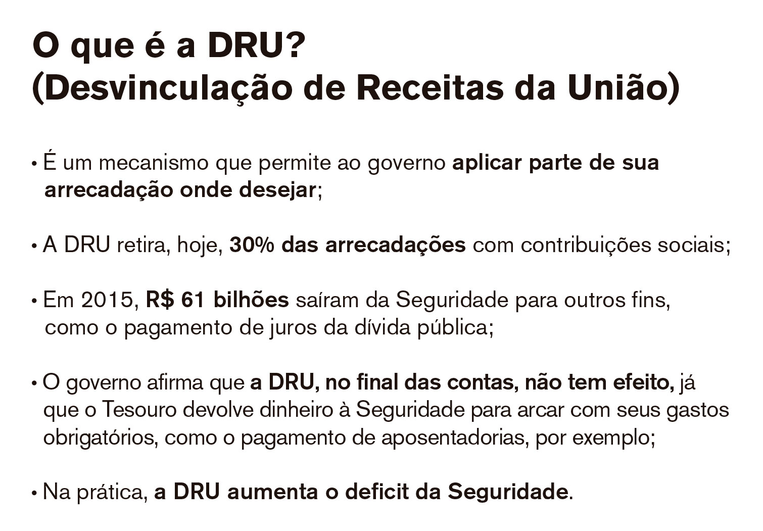 Antes de chegar aos cofres da seguridade, 30% das contribuições sociais são desviadas graças a um mecanismo conhecido como DRU (Desvinculação de Receitas da União). Criada em 1994, ela permite que o governo aplique parte do seu orçamento onde desejar. Até 2015, este percentual era de 20%.