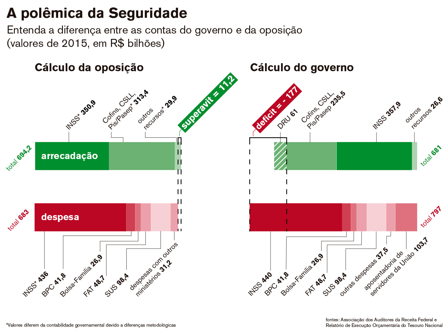 Com essas diferenças metodológicas, pelas contas do governo, em 2015 houve deficit na Seguridade de R$ 177 bilhões e, nas contas da Anfip, houve um superavit de R$ 11,2 bilhões.