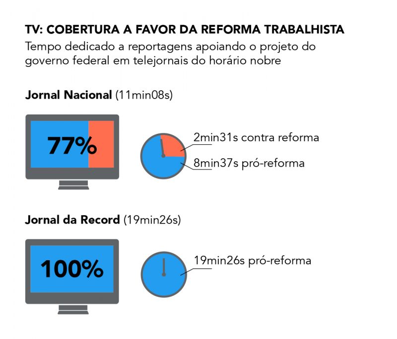 Nenhuma matéria desfavorável à reforma trabalhista e também nenhuma fonte crítica ao projeto de lei apresentado pela gestão de Michel Temer. Assim foram os 19m26s da cobertura do Jornal da Record voltado ao tema. O programa também se dedicou mais que o seu concorrente às mudanças na CLT. Foi um tempo 74,5% maior que o Jornal Nacional em oito reportagens veiculadas.