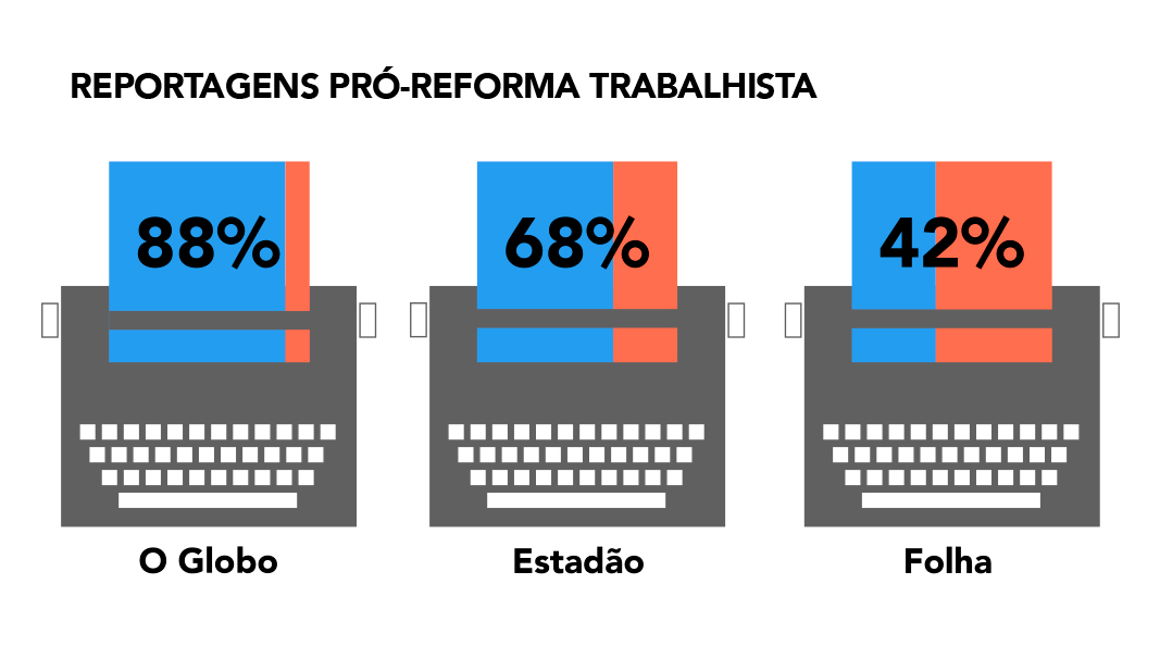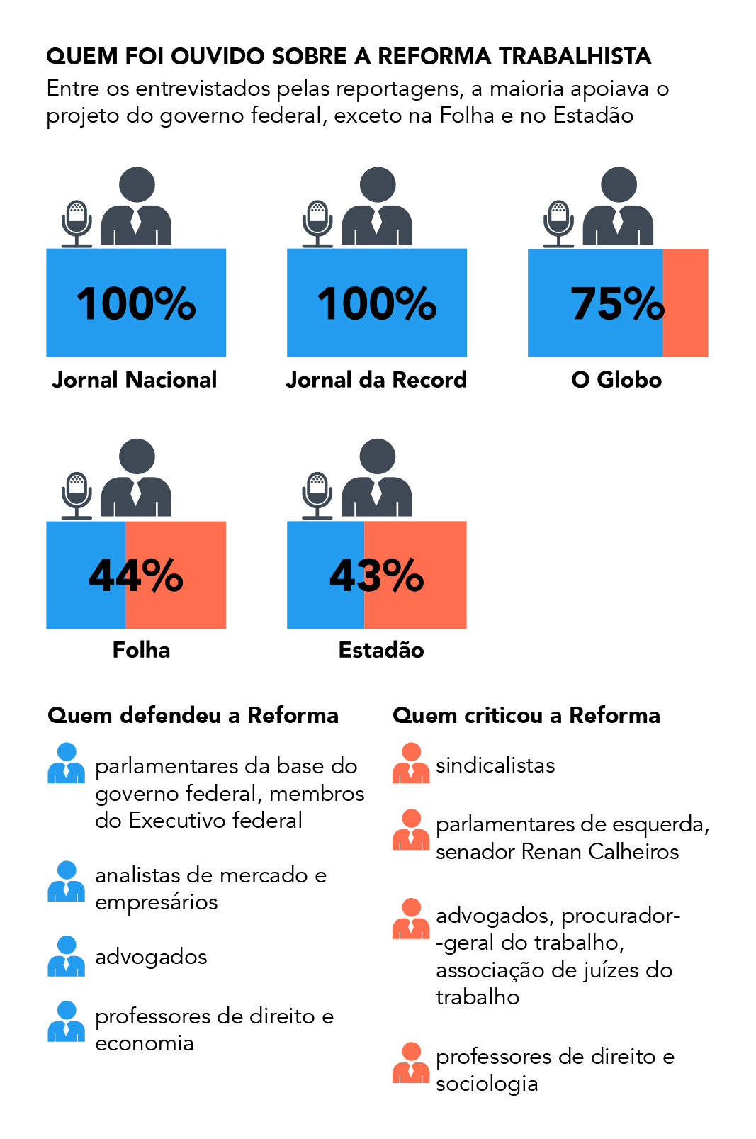 Uma semana antes, a publicação havia trazido reportagem com declaração do presidente da Câmara, Rodrigo Maia, destacada no título: “Sindicatos não querem perder a boquinha”. Das fontes entrevistadas pelo jornal, 57% questionaram a reforma. Mas as críticas ficaram concentradas em uma pequena parte dos 17 textos negativos, ante 36 positivos veiculados no período.