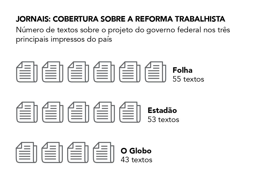 Para chegar a essa conclusão, a Repórter Brasil analisou mais de 150 textos dos três jornais de maior projeção nacional – Folha, O Globo e Estadão – e 30 minutos de matérias dos dois principais telejornais – Jornal Nacional e Jornal da Record. Foram avaliados os cinco dias anteriores e os cinco posteriores à aprovação do relatório do deputado Rogério Marinho (PSDB-RN) na comissão especial da Câmara: de 20 a 30 de abril de 2017.
