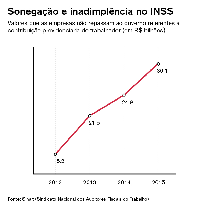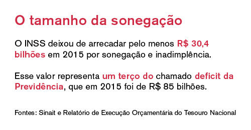 O INSS deixou de arrecadar pelo menos R$ 30,4 bilhões em 2015 devido a sonegação ou inadimplência, de acordo com estudo do Sindicato Nacional dos Auditores Fiscais do Trabalho (Sinait). Esse valor representa pouco mais de um terço (35%) do chamado deficit da Previdência, que naquele ano foi de R$ 85 bilhões.
