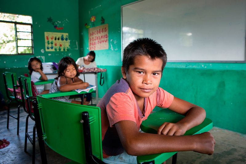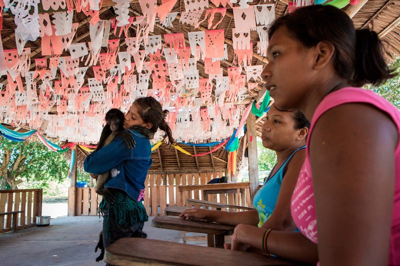 Education in the community. In the community of Malalahá, the school, which has a broken blackboard and no walls, has just one teacher. One of the students, Bia, holds a spider monkey. Photo by Fernando Martinho