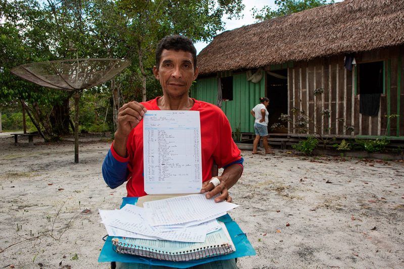 The cost. Former piassava worker Aelton José Pereira Muniz holds up a sheet of paper with the list of expenses he received from the boss. Some items were sold at three times their price. Photo by Fernando Martinho