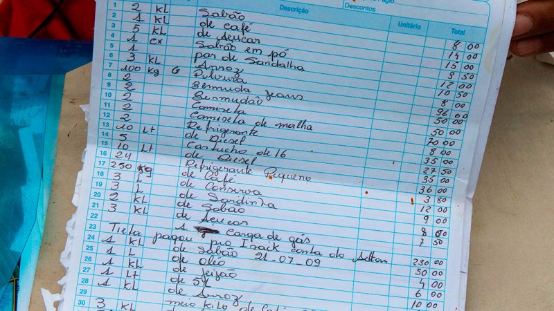 The working relationship is based on a system of loans provided by the bosses who control piassava production. For enough food to last a month, the bosses charge nearly R$1,500 – some items cost 300% more than similar products sold in the town. A kilo of piassava, meanwhile, is worth around R$2. The workers receive what is left (when there is something left) after deducting the loans for the rancho – the name given by the local population for food, transport and basic working equipment. From the amount paid at the end of the month, the employer also withholds 20% for potential impurities. And in some cases another 10% is deducted for the “rent” of their place of work by those who claim to be the owners of the area.