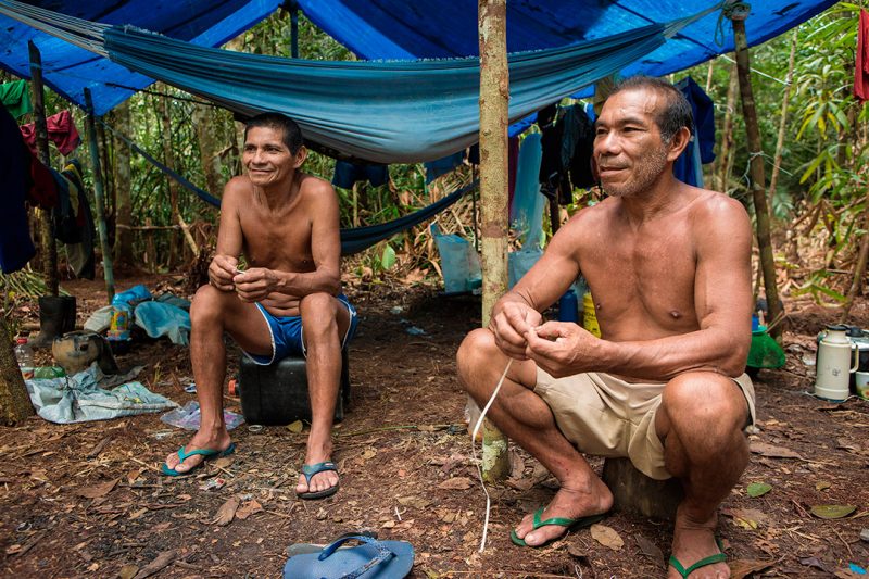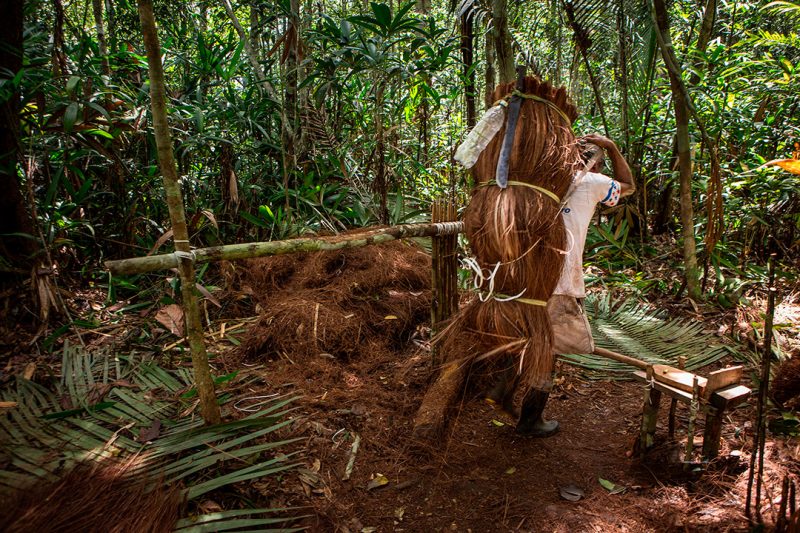 These conditions, however, are viewed as normal by the piassava workers themselves. Augusto, trapped in the system for 48 years, says he is free and that he only works when he wants. “Nobody here forces me to do anything.” He and his brother spent that day, May 28, 2017, working to pay off a “little debt” of R$800 with nearly a ton of piassava. Cutting palm leaves in temperatures that can exceed 30º C in the fall and carrying 60 kilos at a time on their backs is only half the day’s work. While they wait for a tapir that they hunted to cook, Augusto explains that the boss requires them to cut, comb, trim and tie the fibers up into bales. “But we’re not slaves, like people say we are.”