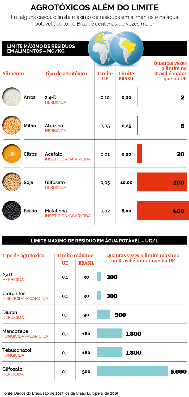 O Brasil tem, segundo o estudo, 504 agrotóxicos de uso permitido. Desses, 30% são proibidos na União Europeia – alguns há mais de uma década. Esses mesmos itens vetados estão no ranking dos mais vendidos. O acetato, tipo de inseticida usado para plantações de cítricos, é o terceiro da lista. Uma nota técnica da Anvisa citada no estudo de Lombardi mostra que o acetato causa a chamada “síndrome intermediária”. Entre os danos à saúde estão fraqueza muscular dos pulmões e do pescoço. Em crianças, o risco é mais acentuado. “A nossa legislação é frouxa no que diz respeito aos resíduos e à quantidade permitidos na União Europeia”, diz Bombardi.