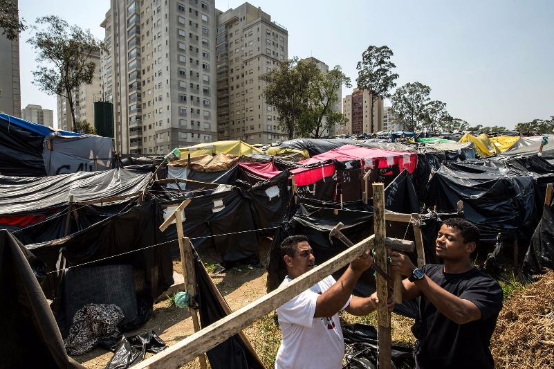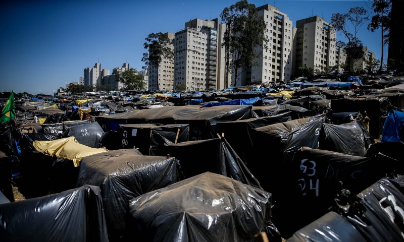 Barracas montadas em área ocupada em São Bernardo do Campo, SP. Foto: Fernando Bezerra Jr./EPA-EFE