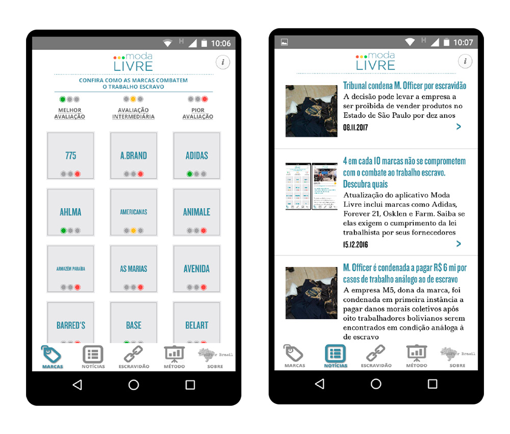 O app também inclui informações sobre empresas nunca responsabilizadas em fiscalizações do governo. A mais recente atualização, lançada a uma semana do Natal de 2017, inclui pela primeira vez nomes conhecidos no mercado nacional como Topper, Rainha, Timberland*, Reserva, Hope e Mash. O aplicativo para smartphones existe desde 2013 e está disponível gratuitamente para iPhone e Android.