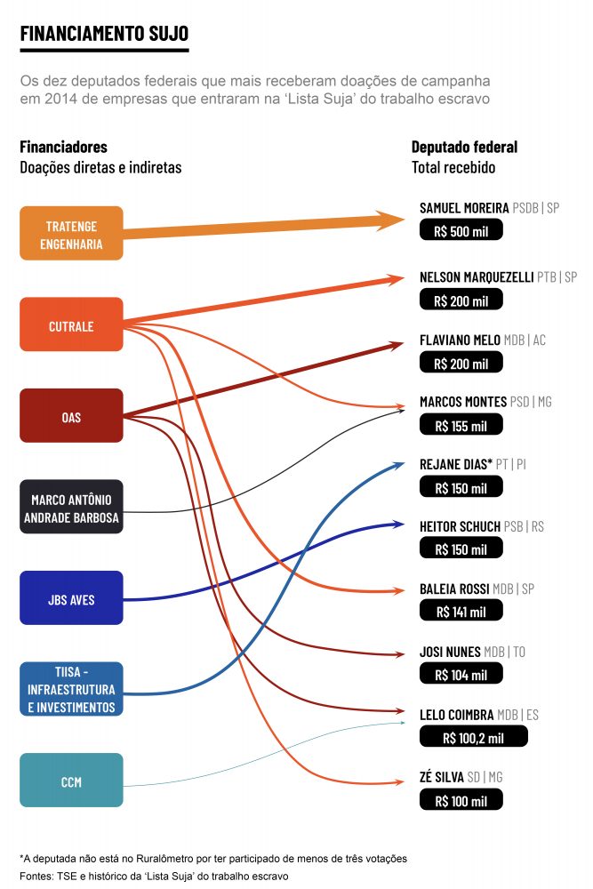 Pelo menos um em cada dez deputados federais teve sua campanha financiada por empresas flagradas utilizando mão de obra análoga à escrava. Na eleição de 2014, 51 dos 513 parlamentares eleitos receberam R$ 3,5 milhões de empresas que estão ou estiveram presentes nos cadastros de empregadores autuados pelo crime.