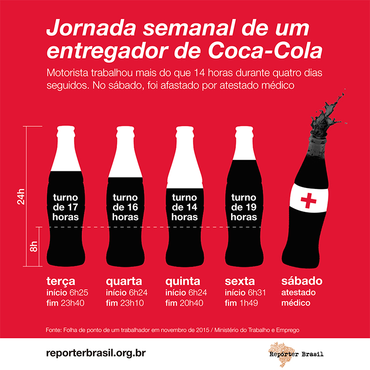 Os caminhoneiros e ajudantes de entrega da Coca-Cola realizavam, em média, 80 horas extras por mês. Situações extremas chegavam a 140 horas extras por mês. Além de dias inteiros de trabalho ininterrupto na mesma semana em que o funcionário já acumulava o cansaço por fazer jornadas de 12 e 14 horas.