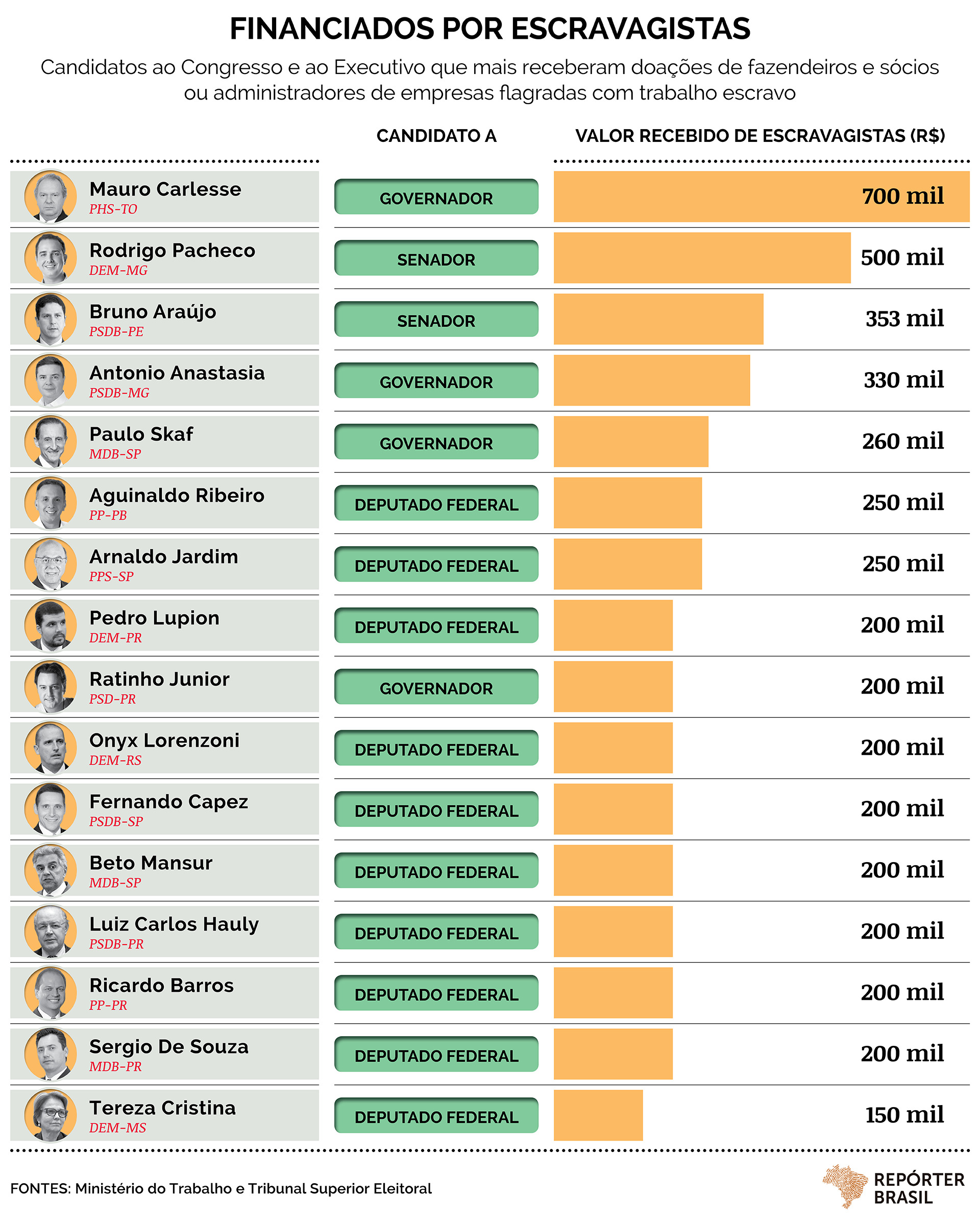 Pelo menos 142 candidatos receberam doações, no valor total de R$ 10,7 milhões, de escravagistas. Entre os políticos financiados por fazendeiros e sócios e administradores de empresas que já estiveram na “lista suja” do trabalho escravo, estão os aspirantes aos governos de São Paulo, Minas Gerais e Goiás: Paulo Skaf (MDB), Antonio Anastasia (PSDB) e Ronaldo Caiado (DEM), respectivamente.