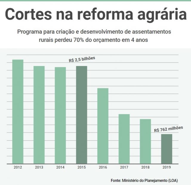 A reforma agrária vem perdendo espaço no orçamento do governo federal desde 2015. Naquele ano, o Congresso aprovou gastos de R$ 2,5 bilhões para o programa Reforma Agrária e Governança Fundiária. Para 2019, a Lei Orçamentária Anual traz a previsão de gastos de R$ 762 milhões – corte de 70% em quatro anos. Essa política inclui não apenas a aquisição de terras para o assentamento das famílias, mas também gestão do cadastro rural, regularização da estrutura fundiária, desenvolvimento dos assentamentos e projetos de assistência social, educação e pacificação no campo.