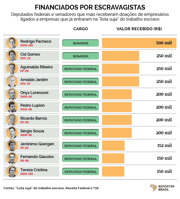 O presidente reeleito da Câmara dos Deputados, Rodrigo Maia (DEM-RJ) e o o candidato derrotado à presidência do Senado, Renan Calheiros (MDB-AL), também integram o grupo, que corresponde a 25% da Câmara e 21% do Senado. Os senadores Cid Gomes (PDT-CE), Rodrigo Pacheco (DEM-MG) e Luis Carlos Henize (PP-RS) estão entre os 14 congressistas que receberam tanto de desmatadores quanto de escravagistas.