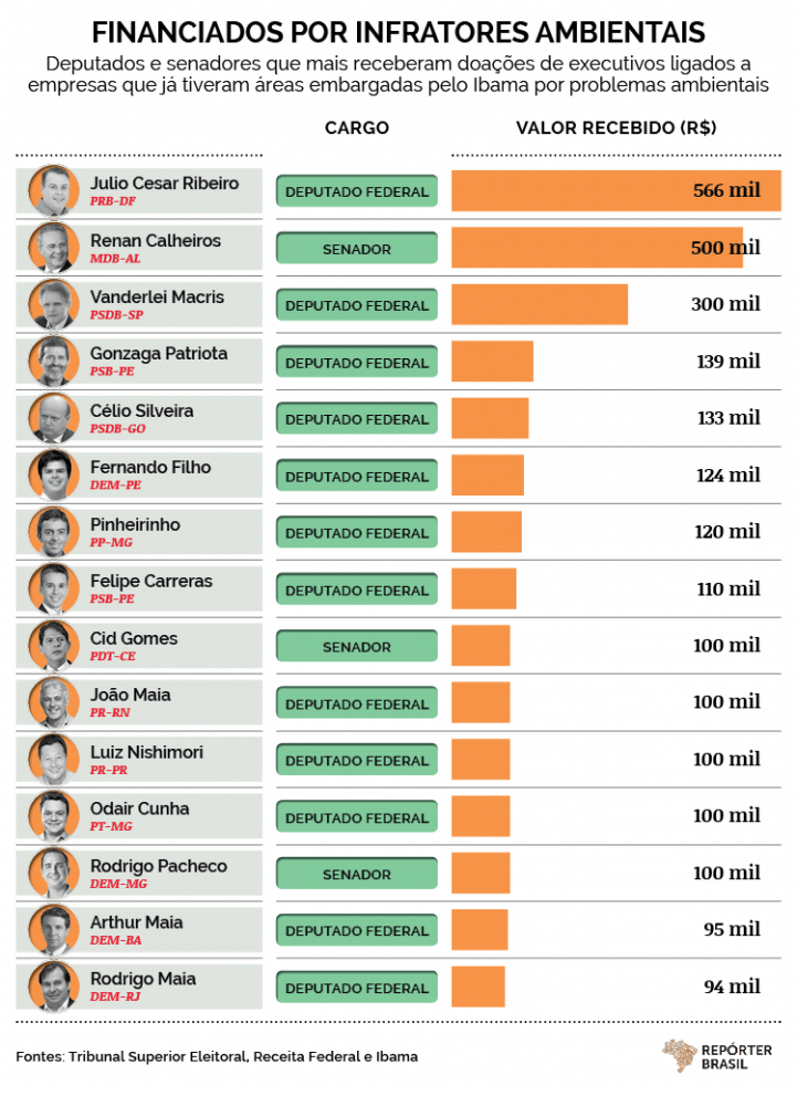 Entre os que mais receberam estão os senadores Renan Calheiros e Rodrigo Pacheco: R$ 500 mil cada um. O alagoano recebeu doação de R$ 500 mil de Cícero Rafael Tenório da Silva, empresário do ramo de logística em Alagoas, que já foi autuado dez vezes pelo Ibama por desmatamento. Ele chegou a pagar R$ 168 mil em multas pelo crime ambiental.