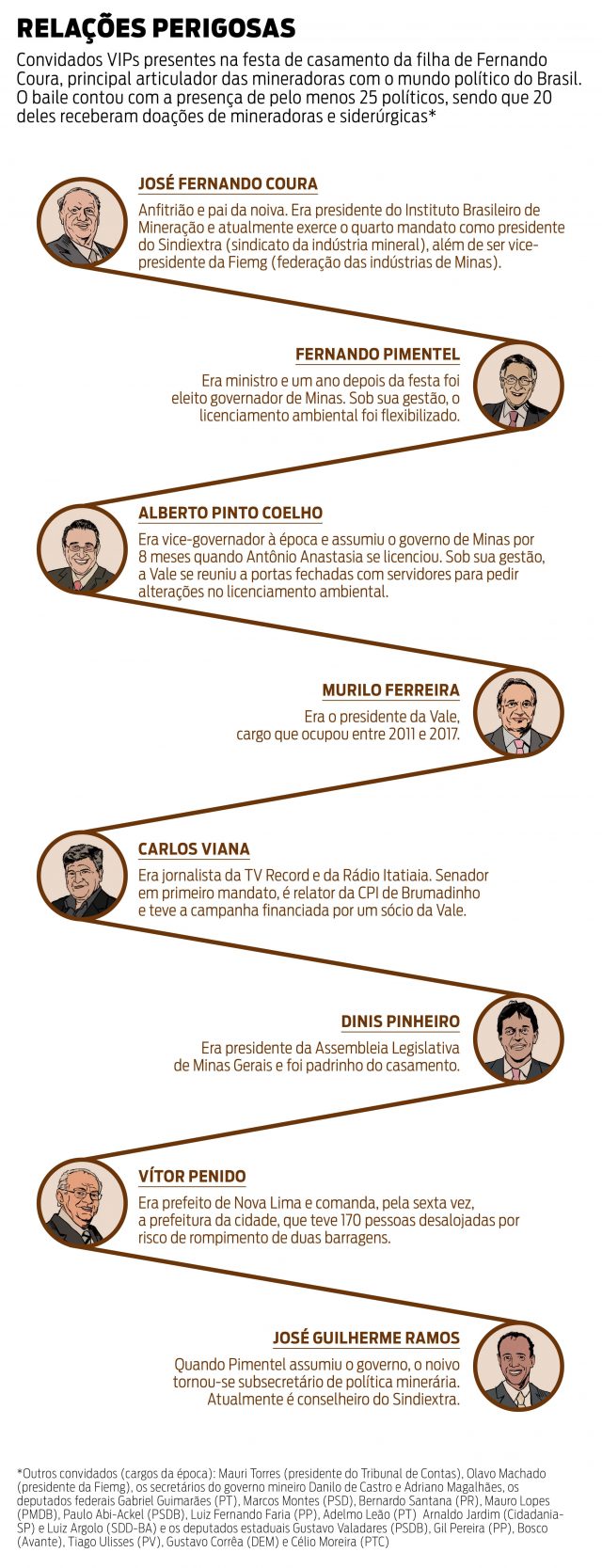 Desde novembro de 2015, quando a barragem do Fundão rompeu em Mariana, diversas reportagens e estudos mostraram o recorrente e milionário investimento de empresas ou de executivos da mineração em campanhas políticas. Essa proximidade ficou explícita no casamento da filha de Coura, que hoje exerce o quarto mandato à frente do Sindicato da Indústria Mineral do Estado de Minas Gerais (Sindiextra) e que também é vice-presidente da Fiemg. Dos cerca de 25 políticos presentes à festa, pelo menos 20 tiveram campanhas financiadas por mineradoras ou siderúrgicas nas eleições de 2010 ou na seguinte ao casamento, em 2014.