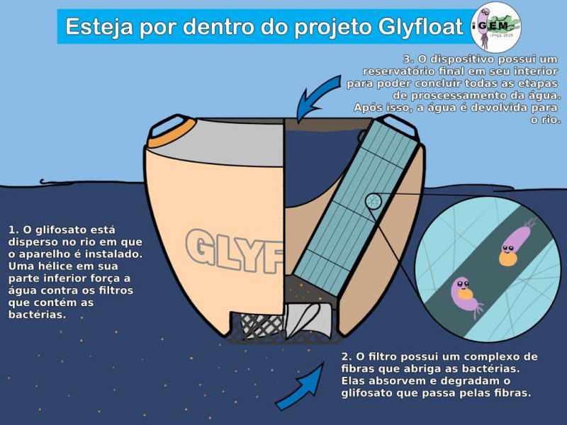 Um desses projetos é o GlyFloat, uma espécie de filtro-boia com microrganismos programados biologicamente para degradar resíduos de glifosato, o agrotóxico mais utilizado no Brasil, com mais de 173 mil toneladas vendidas apenas em 2017.