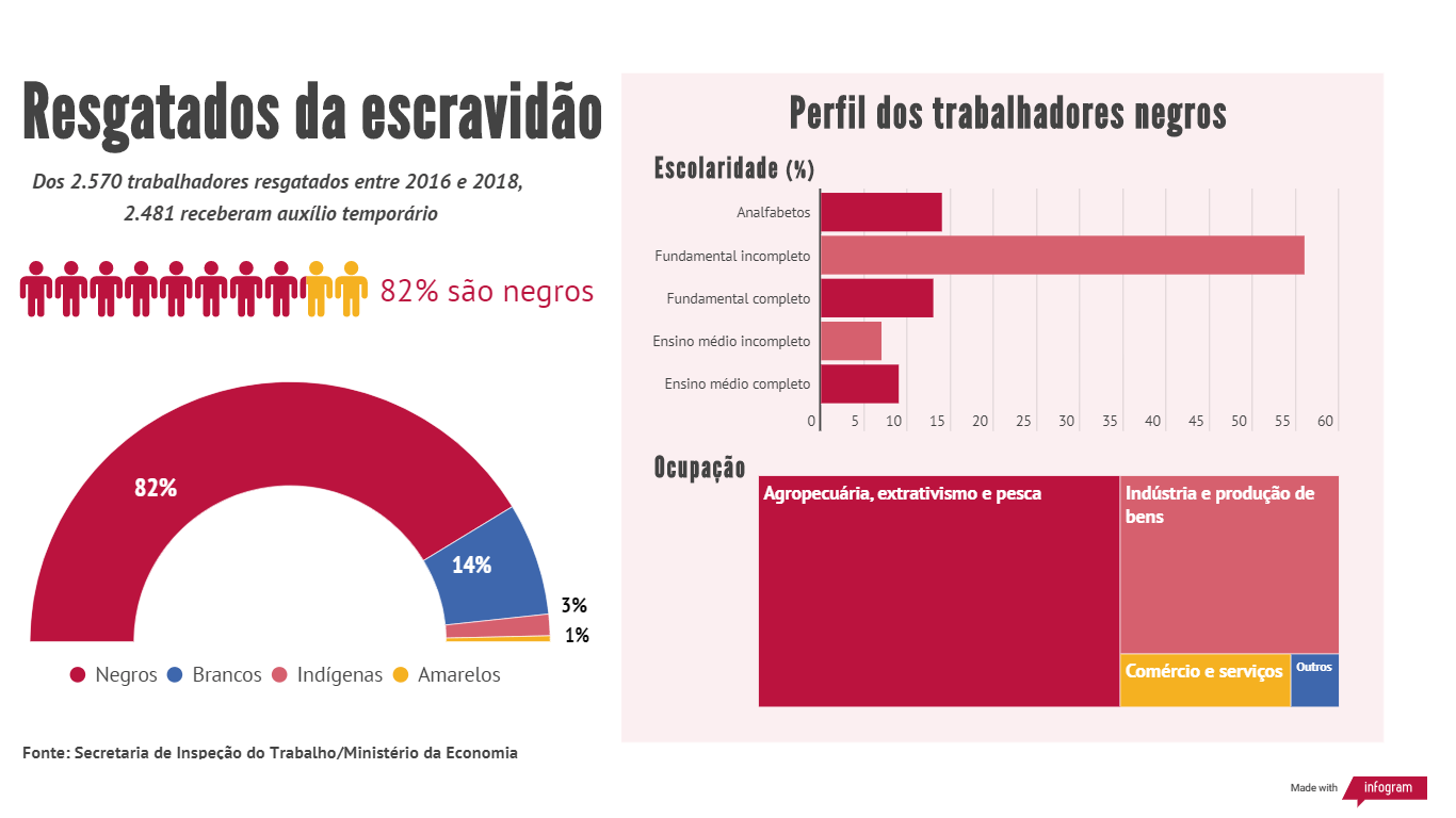 João é parte dos números que, para especialistas, comprovam a marginalização das populações negras. A cada cinco trabalhadores resgatados em situação análoga à escravidão entre 2016 e 2018, quatro são negros. Pretos e pardos representam 82% dos 2,4 mil trabalhadores que receberam seguro-desemprego após resgate. Entre os negros resgatados estão principalmente homens (91%), jovens de 15 a 29 anos (40%) e nascidos em estados do Nordeste (46%). O levantamento foi feito pela Repórter Brasil, com base em dados obtidos da Subsecretaria de Inspeção do Trabalho, por meio da Lei de Acesso à Informação.