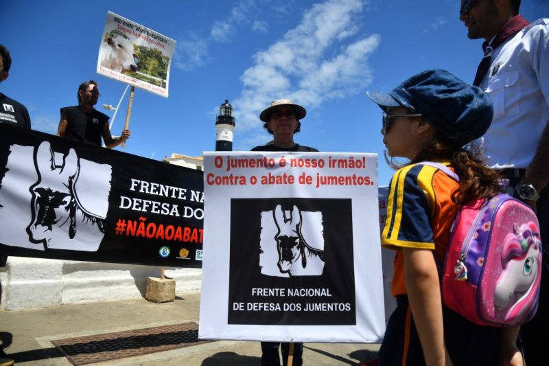 Manifestação do Fórum Nacional de Defesa dos Jumentos, no Farol da Barra, em Salvador, une entidades para combater os maus-tratos aos jumentos. (Foto: Alexandre Guzanshe)