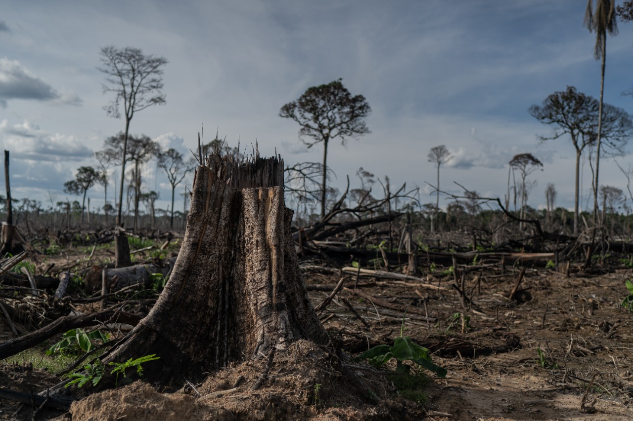 Em uma tarde de novembro, a atmosfera defumada pelas queimadas ainda era perceptível no lote de 100 hectares de um posseiro conhecido como Carneiro. Ele derrubou a maior parte da cobertura vegetal de sua área – muito mais do que os 20% que lhe caberiam, fosse essa uma ocupação legal de terras no bioma amazônico – para plantar 40 mil pés de banana. “Ainda quero plantar mais 20 mil”, planeja. Entre o verde dos brotos de meio metro de altura, troncos e restos de floresta carbonizados.