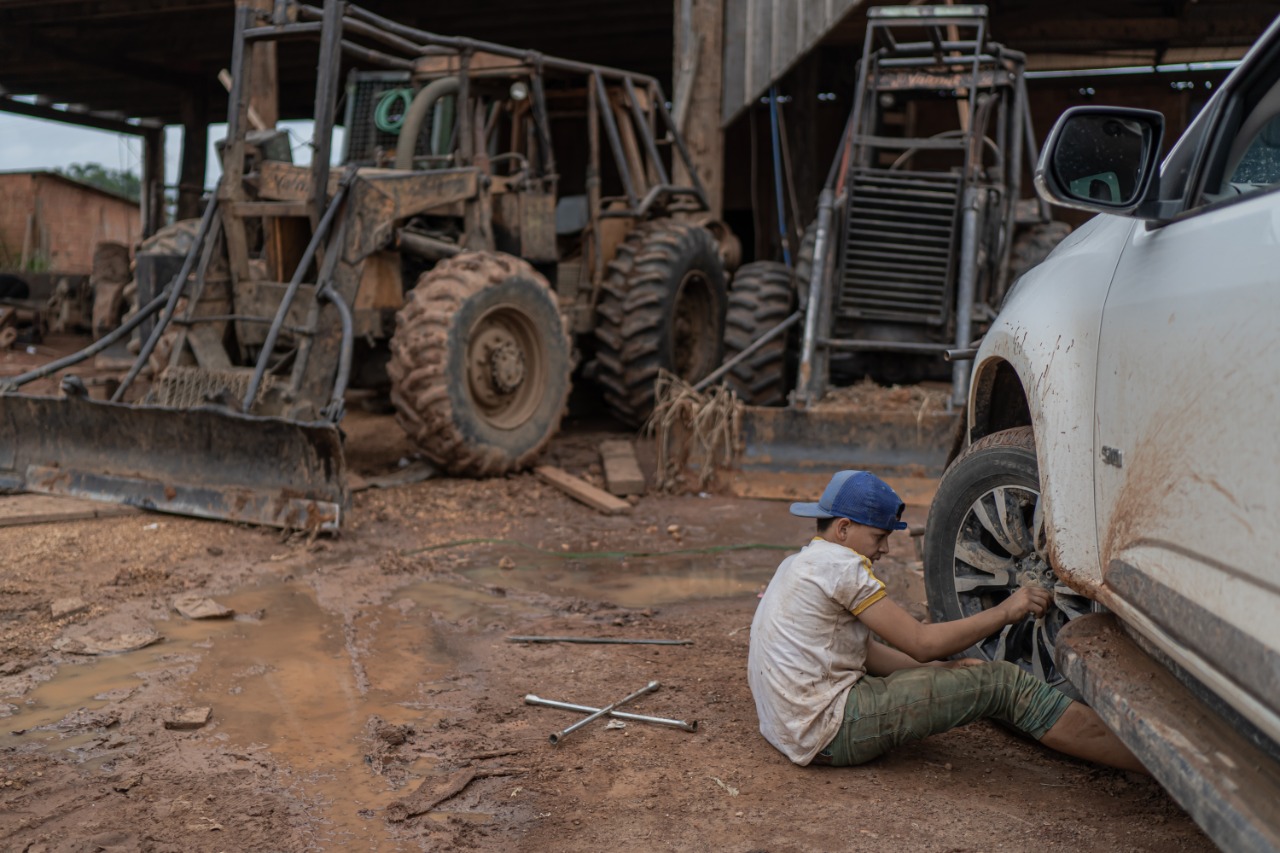 Ele presta serviços de extração de madeira. Conhece o ofício como ninguém, do maquinário ao funcionamento dos planos de manejo, às próprias árvores. “Já fiz muita extração ilegal, mas agora não mais”, garante. Na segunda vez em que conversamos, me mostra um vídeo no celular. Seu filho mais velho, na boleia de um caminhão, ouvindo música romântica, de madrugada, “puxando madeira”. Ele se emociona. “Esse é o nosso sonho. Só isso.”