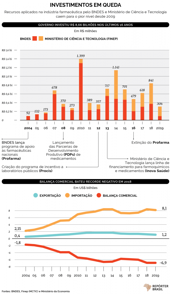 Enquanto caem os investimentos públicos no setor, crescem os gastos com a importação de remédios, vacinas e insumos farmacêuticos [matéria-prima para a produção de remédios]. A balança comercial atingiu em 2018 e 2019 recorde negativo histórico de US$ 6,9 bilhões, segundo o Ministério da Economia. Foram US$ 8,1 bilhões em importações e US$ 1,2 bilhão em exportações no ano passado.