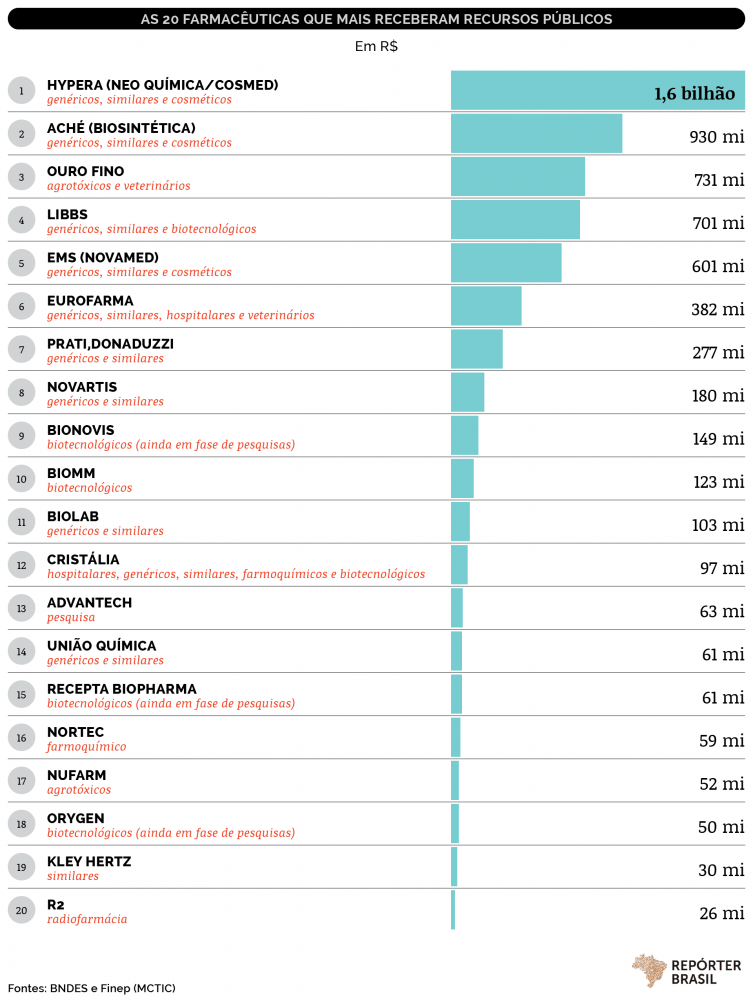 Na Finep, os valores liberados em 2019 somaram R$ 219 milhões, queda de 53% ante os R$ 470 milhões investidos no ano anterior. A maior parte do investimento foi para o programa de inovação da Hypera Pharma (R$ 111 milhões). A fabricante de genéricos (ex-Hypermarcas) é a que mais recebeu recursos públicos nos últimos 16 anos: R$ 1,6 bilhão. Procurada, a Finep diz que segue apoiando o setor farmacêutico e disponibilizando as linhas de crédito previstas. “Eventuais aumentos e reduções de valores apoiados refletem a demanda por recursos pela própria indústria”, diz a financiadora, em nota.