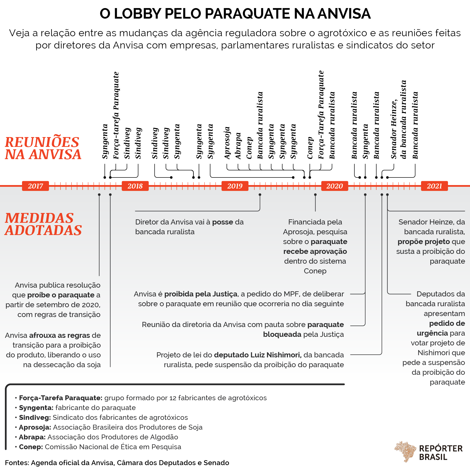 Os encontros da indústria na agência voltaram a acontecer neste ano, com reuniões específicas sobre o paraquate com a Syngenta e a bancada ruralista em fevereiro e março. No final de março, a revisão do prazo de banimento entrou na pauta da reunião da diretoria colegiada da Anvisa, soando o alerta do Ministério Público Federal.