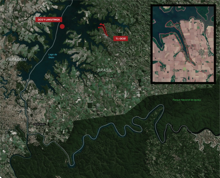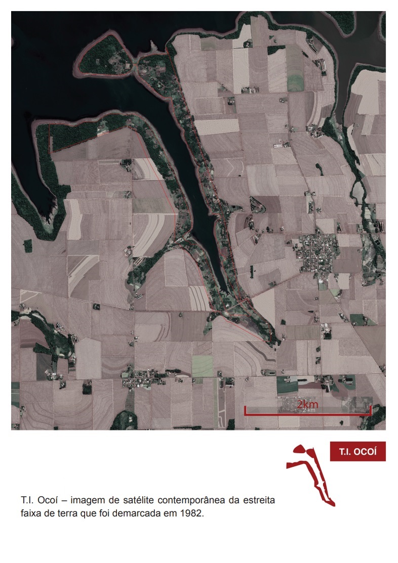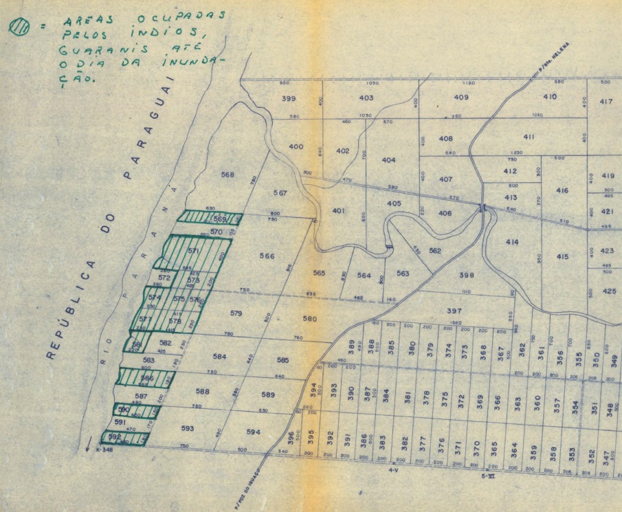 Em 1977, por exemplo, a presença indígena é indicada em mapa feito por Itaipu com uma pequena área de ocupação indígena (veja pequena faixa em vermelho), ignorando registros anteriores que afirmavam que as comunidades ancestrais estavam por toda a região.