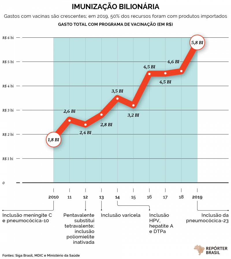 A compra e distribuição de vacinas no SUS saltou 226%, de R$ 1,8 bilhão, em 2010, para R$ 5,8 bilhões em 2019 (em valores atuais), segundo levantamento da Repórter Brasil no portal do orçamento do Senado. Só no ano passado, o governo gastou R$ 1,2 bilhão a mais com o programa de imunização por causa da importação de duas vacinas: a meningocócica ACWY e a de sarampo – que teve de ser importada porque a fábrica da Fiocruz não deu conta da demanda gerada pela epidemia da doença.