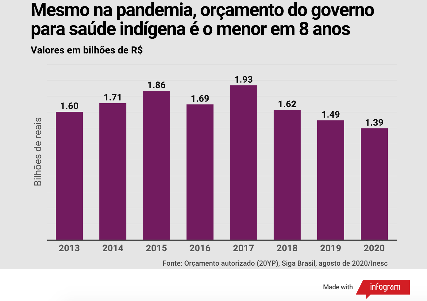 O aparelhamento político desses distritos vem acompanhado do maior corte orçamentário para a saúde indígena nos últimos oito anos, mesmo diante da maior pandemia do século. Os gastos executados em 2020 representam queda de 13% em relação ao de 2019 para a saúde indígena, segundo um levantamento feito pelo Instituto de Estudos Socioeconômicos (Inesc).