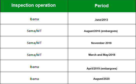 Between 2016 and 2019, Sema/MT notified the Formoso Farm complex 17 times for environmental violations only (see table below with inspection operations and periods), totalling fines in excess of R$ 3.5 million. Alexandra Aparecida Perinoto, a resident of Sinop (MT), responds individually for most of these violations, in addition to appearing as a beneficiary of the authorizations and the property’s main owner in both land property and environmental documents. Some of the notifications also mention her children. The 2016 inspections resulted in interdictions that are still valid, but, as pointed out by the state environmental department, they refer only to specific areas where irregularities have been found, and their effects “do not extend to other parts of the property” – as provided for in the legislation.