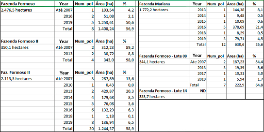 With this trick, no interdictions appear to the main area of Formoso/Agromaster Fomento Agrícola III, even though 56.9% of its area has been deforested (above the limit of 20% established to guarantee the Legal Reserve in the Amazon biome). As a result of the same chicanery, the Mariana Farm itself has a very low percentage of degradation (35.6%), and separate lots appear intact, such as “Formoso Farm/Lot 14”, since it is smaller and “separate” from the others “lots” that form the whole of the Formoso Farm.
