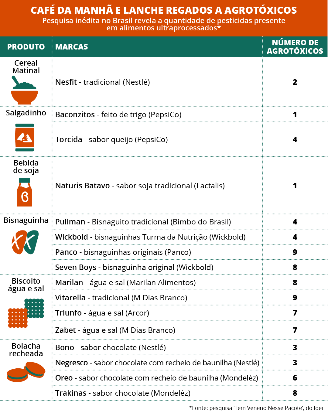 O estudo ‘Tem veneno nesse pacote’, realizado pelo Instituto Brasileiro de Defesa do Consumidor (Idec), mostrou que 59% dos produtos ultraprocessados mais consumidos no país tinham resíduos de agrotóxicos. Foram testados 27 produtos, divididos em 8 categorias de alimentos e bebidas (veja tabela abaixo). Todos os que tinham trigo em sua composição apresentaram resíduos de algum agrotóxico. Em 51,8% foi possível verificar a presença de glifosato, considerado potencialmente cancerígeno, ou glufosinato, herbicida relacionado à má formação embrionária e a problemas no sistema nervoso central em ratos.