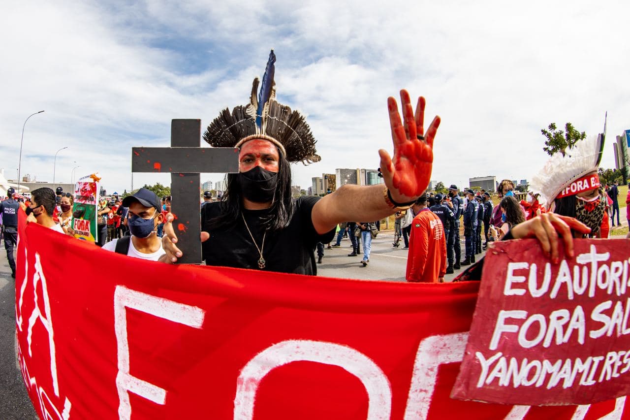 Manifestante em Brasília, no último sábado, criticou a política relacionada aos indígenas do governo Bolsonaro (Foto: Mídia Ninja)